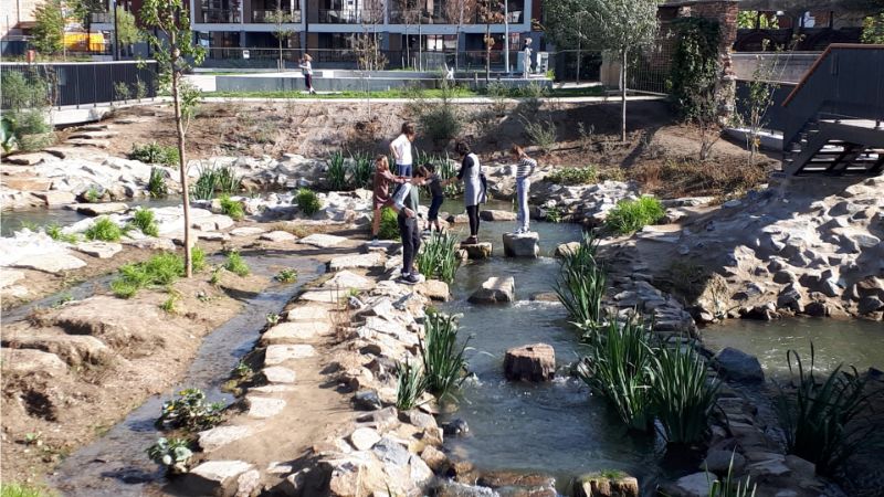 Lors de la conception, on a privilégié une échelle à poissons qui soit aussi excitante pour les poissons qui l’utilisent que pour les visiteurs du Sluispark qui les observent. Des pierres de gué permettent ainsi de marcher autour de l’échelle à poissons ou de la traverser. Cela permet de venir plus près de l’eau et d’avoir une meilleure expérience. Et les gens sont très nombreux à apprécier la chose, comme en attestent les photos ci-dessous.