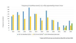 Als we kijken naar de data zien we dat de overstort inderdaad minder frequent in werking treedt.